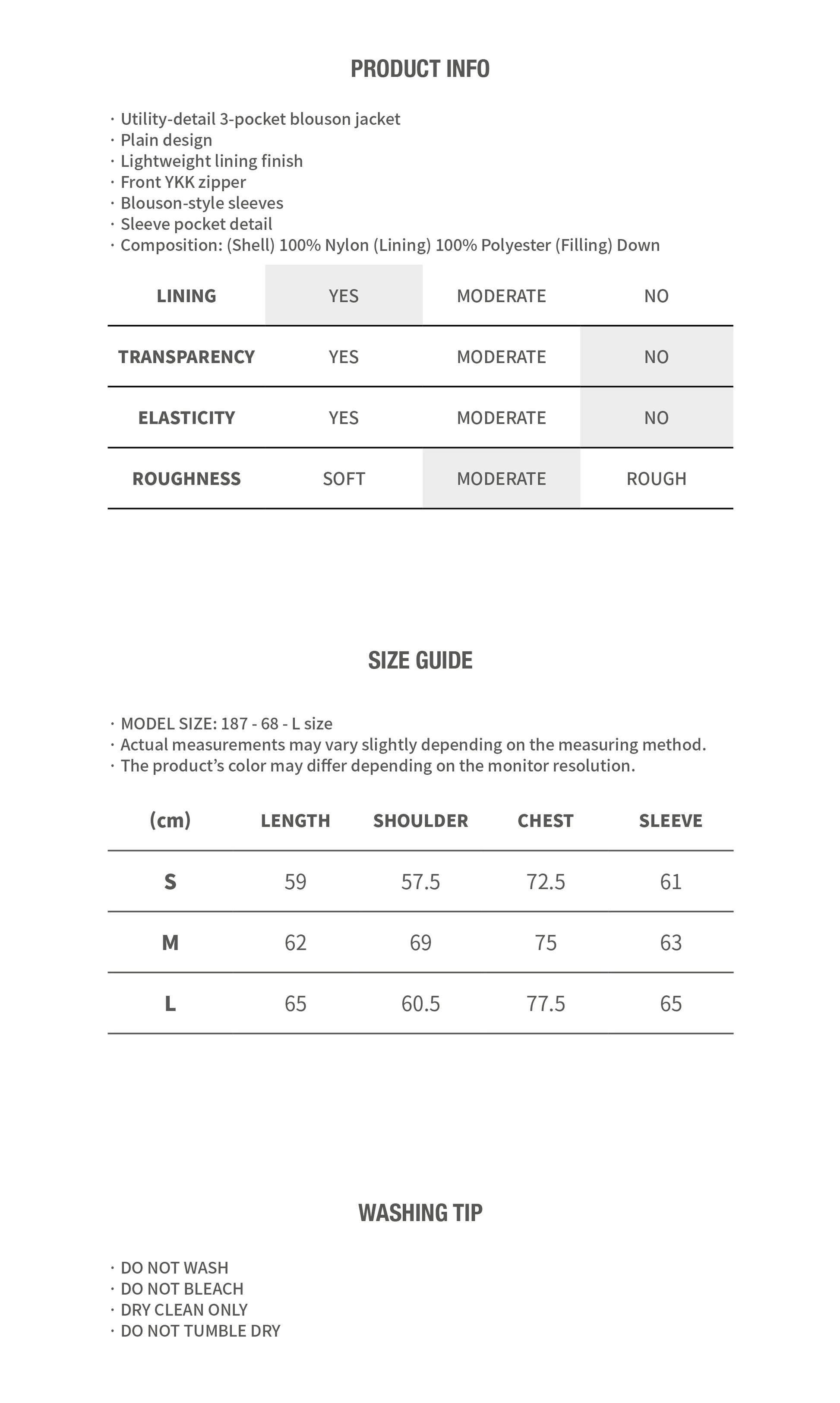 · Composition: (Shell) 100% Nylon (Lining) 100% Polyester (Filling) Down